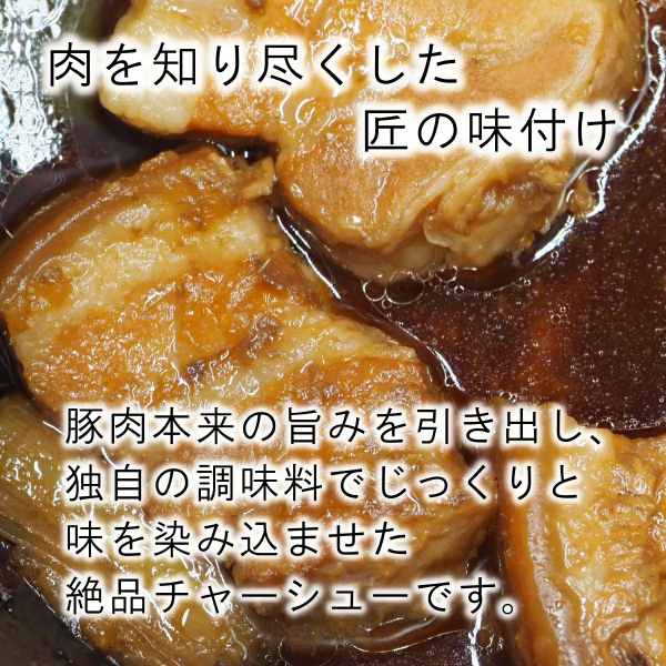 豚肉本来の旨みを引き出し、独自の調味料でじっくりと味を染み込ませた絶品チャーシューです。トロっとほろほろな口どけの良い贅沢な一品をご自宅で手軽にお楽しみいただけます。