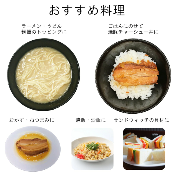 焼きめし(炒飯)や焼き豚丼、照り焼きサンドイッチなど、様々な食べ方でお楽しみいただけます。