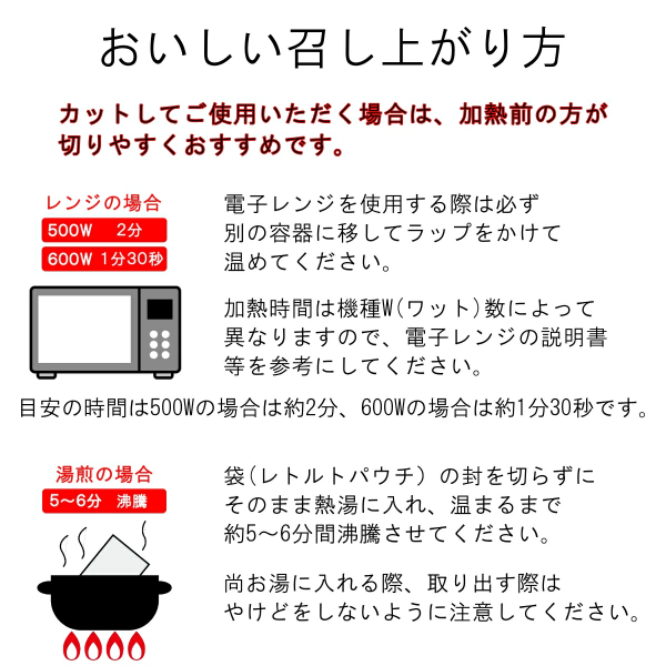 袋(レトルトパウチ)の封を切らずにそのまま熱湯に入れ、温まるまで約5〜6分間沸騰させて下さい。