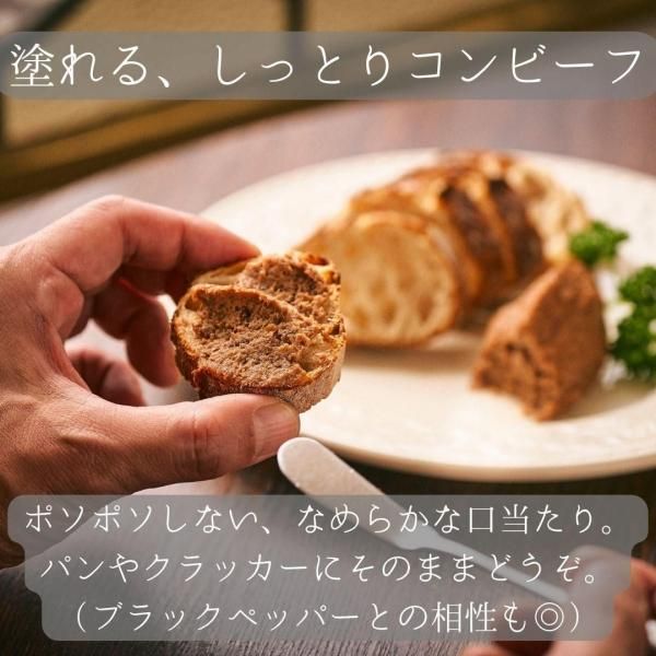 従来のポソポソしたコンビーフとは異なり、しっとりとなめらか。バゲットやクラッカーに塗るだけで贅沢なおつまみに。